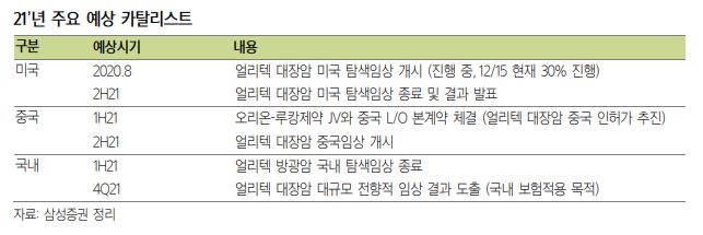 정준영 삼성증권 연구원은 "얼리텍 폐암 진단키트 가치의 잠정적 제외, 미국 확증 임상 개시시점을 내년 2분기에서 2022년 1분기로 조정함에 따라 미국시장 초기 점유율이 소폭 하향할 것으로 보인다"며 "그간 미국 임상 지연에 따른 디스카운트와 폐암 반려 전후 급락으로 주가가 부진했으나 미국과 중국에서의 임상 개시와 결과 확인에 따라 디스카운트 해소와 해외사업 가치가 재부각 될 것"이라고 말했다.