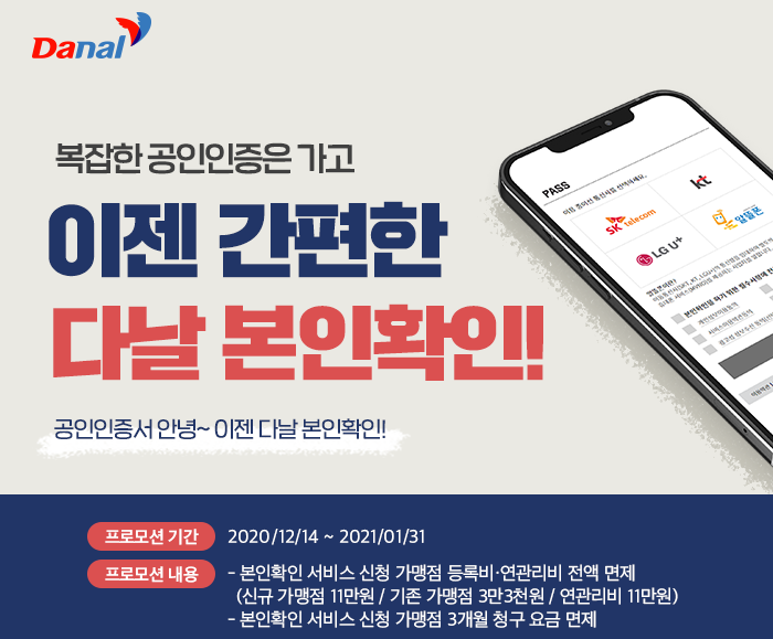 통합결제 비즈니스 전문기업 다날이 ‘민간 전자서명 시대’를 맞아 휴대폰 본인확인 서비스 가맹점을 위한 ‘등록비·청구요금 면제’ 프로모션을 진행한다고 15일 밝혔다.