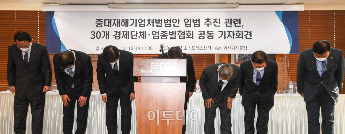 김용근 한국경영자총협회 부회장을 비롯한 주요 경제단체 관계자들이 16일 서울 중구 프레스센터에서 열린 '중대재해기업처벌법안 재정에 대한 경제계 공동 기자회견'에 참석해 인사하고 있다. 참가단체들은 이날 기자회견에서 "헌법과 형법을 크게 위배하면서까지 경영 책임자와 원청에 대해 필연적으로 가혹한 중벌을 부과하려는 중대재해기업처벌법안의 제정에 반대한다"고 밝혔다.