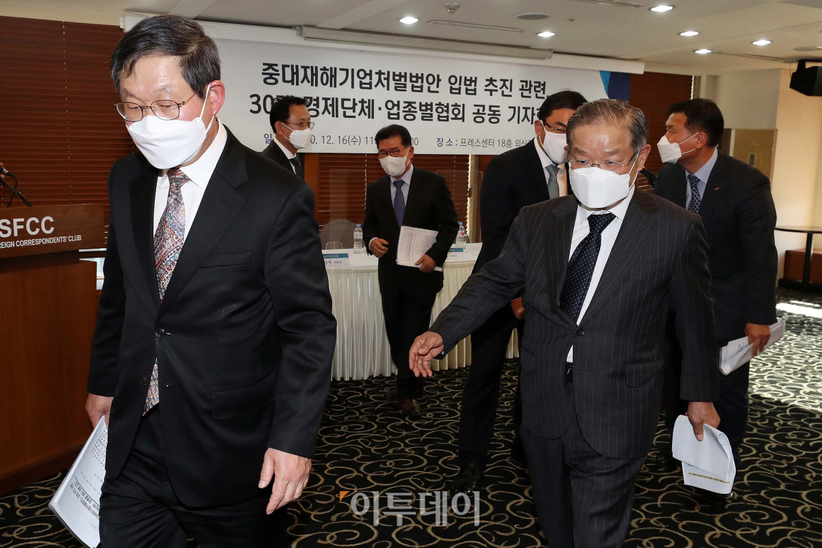 김용근 한국경영자총협회 상근부회장(왼쪽) 등 경제단체 관계자들이 16일 오전 서울 중구 프레스센터에서 열린 '중대재해기업처벌법안 입법 추진 관련, 30개 경제단체·업종별협회 공동 기자회견'을 마친 뒤 회견장을 나서고 있다. 이날 경제단체들은 "헌법과 형법을 크게 위배하면서까지 경영 책임자와 원청에 대해 필연적으로 가혹한 중벌을 부과하려는 중대재해기업처벌법안의 제정에 반대한다"고 밝혔다.