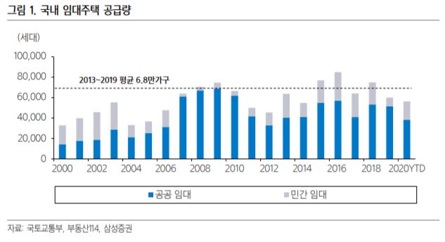 2013~2017년 연평균 임대주택 공급량은 6만9000가구(민간임대주택은 2만여 가구, 공공임대주택은 5만 가구 내외)였으며 올해는 6만 가구 마저 밑돌 가능성이 높다고 삼성증권은 전망했다. 공공임대주택은 공기업의 예산 한계로 의미 있는 증가가 어렵기에, 민간의 역할과 민간 임대주택의 사업성 보완을 위한 정책적 지원이 중요하다.