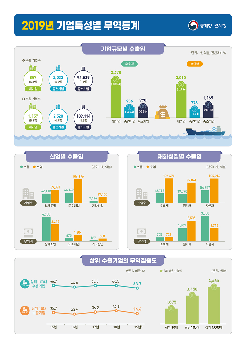 상위 10대 수출 기업의 무역 집중도는 34.6%로 2016년(33.9%) 이후 3년 만의 최저치를 보였다. 전체 수출 기업 수는 9만 7418개로 전년보다 1.2% 증가했다. 평균 수출 품목 수도 5.8개로 시계열이 있는 2010년 이후 가장 많았다.