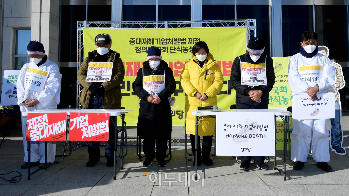 20일 서울 여의도 국회 본청 앞에서 중대재해기업처벌법 제정을 촉구하며 단식 10일차를 맞은 강은미 정의당 원내대표, 고 이한빛 PD 부친 이용관씨, 고 김용균 씨 모친 김미숙 김용균재단 이사장, 이상진 민주노총 부위원장 등이 대국민 기자회견에 앞서 산재사망 노동자를 위한 묵념을 하고 있다.