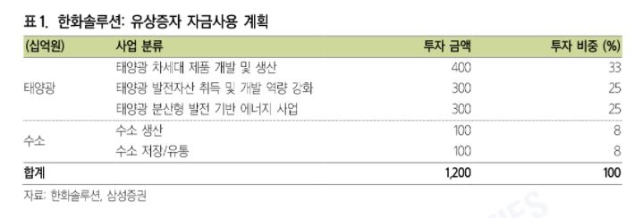 한화솔루션이 공시한 내용에 따르면 증자 자금은 태양광 1조 원과 수소 2000억 원의 투자에 사용한다. 태양광 내에서도 차세대 제품 생산과 개발에 4000억 원, 태양광 발전자산 취득과 역량 강화에 3000억 원, 분산형 발전기반 에너지 사업에 3000억 원을 사용한다.