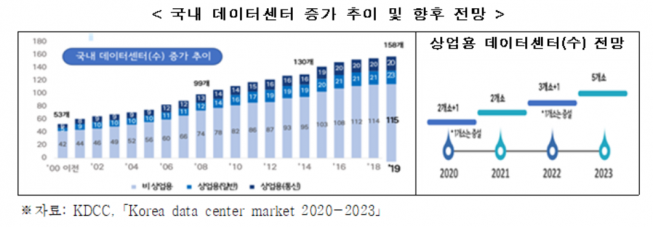이 같은 성장세에 국내에서도 데이터센터를 구축하려는 움직임이 활발하다. 국내 데이터센터는 2000년 53개에서 지난해 158개로 매년 5.9% 성장하고 있다. 같은 기간 상업용 데이터센터는 연평균 7.4% 증가해 43개가 구축·운영되고 있다. 올해부터 2023년까지 상업용 데이터센터는 12개 이상 증가할 것으로 전망되고 있다.