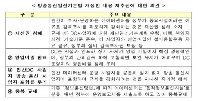당시 개정안은 자연재해 등 비상사태에 대비해 민간 데이터센터를 방송·통신시설처럼 국가재난관리시설로 지정하고, 정부가 감독조사권을 갖고 안전하게 관리하겠다는 내용이었지만, 지나친 자료제출 요구 등에 따른 업계 자율성 및 영업비밀 침해 우려, 중복규제 논란 등으로 국회를 통과하지 못했다.