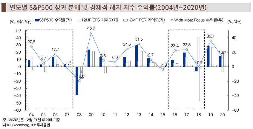 IBK투자증권은 2021년 유동성 공급 강도는 다소 제한될 것으로 진단했다. 특히 이익의 본격적인 회복 등의 펀더멘털 장세 전환은 ‘경제적 해자’ 기업에 우호적인 여건이 형성될 것이라고 전망했다.