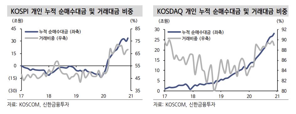 ◇ 최유준 신한금융투자 연구원 = 각국이 방출한 막대한 유동성으로 글로벌 차원의 증시 랠리가 펼쳐졌다. 개인의 직접 투자도 많이 증가했다. 한국의 ‘동학개미’와 미국의 ‘로빈후더’가 대표적이다. 가계 금융자산 중 주식 비중도 늘어났다. 한국은 전년 대비 4.5%포인트(p) 증가한 것으로 추정된다. 랠리가 이어질수록 자금이 지속 유입돼 개인투자자의 영향력이 확대됐다. 급락 이후 반등을 경험한 학습효과와 주가 상승으로 추종 매매가 늘어났지만, 주식이 유일한 투자 대안이라는 인식이 크게 작용했다.