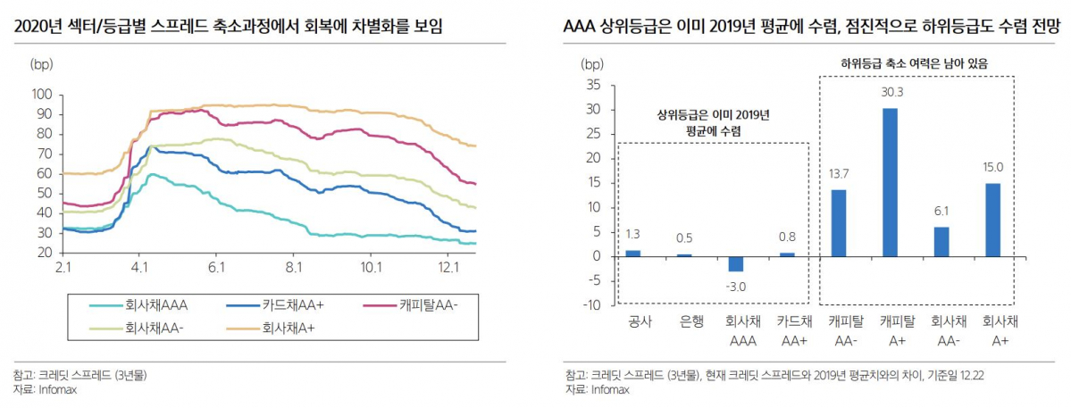 특히 캐피탈채, 회사채 AA/A등급 위주로 스프레드 축소가 나타날 것으로 예상했다. 공사채, 은행채의 경우 크레딧 스프레드 레벨이 2019년 평균과 비슷한 수준으로 축소됐지만, 캐피탈A+은 30.3bp(1bp=0.01%), 회사채A+은 15bp 등 2019년 평균 대비 스프레드 레벨이 높은 상태를 유지 중이다.