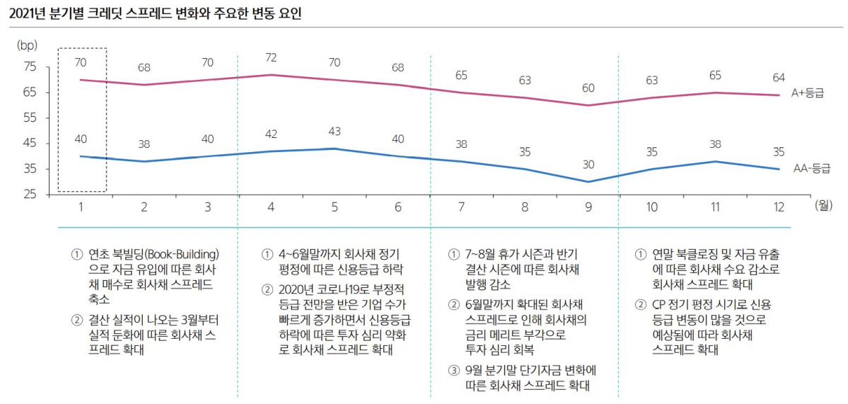 이에 따라 연초 크레딧 스프레드 축소가 나타나는 ‘연초효과’가 없을 수도 있다는 전망이 나오지만, 크레딧 전문가는 연초에도 풍부한 시중 자금 상황이 이어지면서 연말의 연장선에서 축소가 진행될 수 있다고 판단했다.