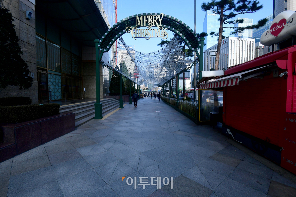 코로나19 재확산 기세를 꺾기 위해 5인 이상 모든 사적 모임을 제한하는 등 연말연시 특별 방역대책이 시행된 가운데 24일 서울 을지로 거리가 크리스마스이브임에도 썰렁하다.