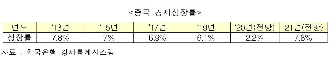 중국경제 전문가들은 2020년 중국 경제성장률을 2.2%, 2021년 성장률을 7.8%로 전망했다. 올해 중국은 코로나 상황에서도 플러스 성장이 예상되는 국가 중 하나이며, 내년에는 올해 저성장의 기저효과 등으로 2013년 이후 최대 폭 성장률을 기록할 것으로 전망된다. 국제통화기금(IMF)도 중국의 내년 경제성장률을 8.2%로 전망했다.