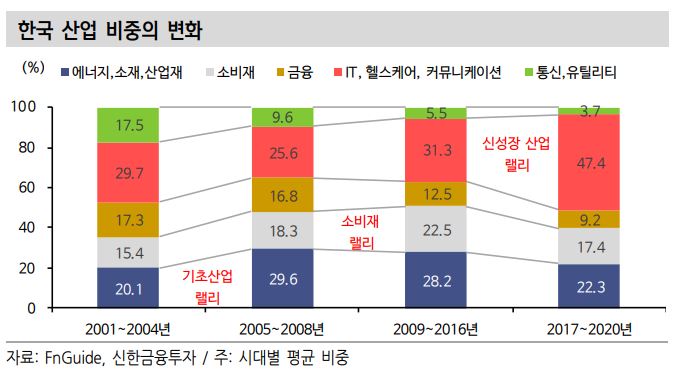 신한금융투자는 29일 "국가 위험 감소와 신성장 산업 비중 증가, 주주환원 증대는 한국 밸류에이션(가치) 상향 요인"이라며 "1분기 코스피 밴드는 2600~3200이 될 것"이라고 전망했다.