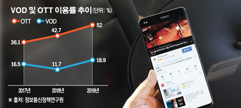 정보통신정책연구원(KISDI)이 지난달 발간한 ‘VOD와 OTT 이용행태 추이 분석’에 따르면 지난해 기준 전체 응답자의 52%가 OTT를 이용한 것으로 나타났다. 국민 절반이 OTT를 이용하는 것과 같다. OTT 이용률은 2017년 36.1%, 2019년 42.7%로 3년간 꾸준히 증가하는 추세다. 시장도 같이 크고 있다. 방송통신위원회의 ‘2019 방송시장 경쟁상황 평가’에 따르면 국내 OTT 시장 규모는 올해 7801억 원으로 추정된다. 이는 2014년 1926억 원에서 4배 이상 증가한 규모다.