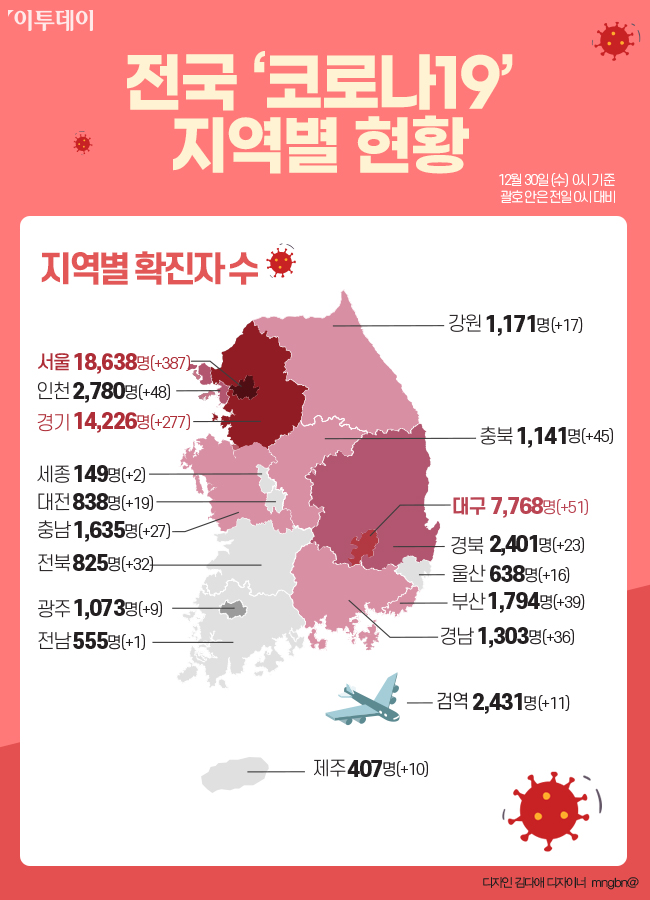 이로써 전국 시·도별 코로나19 확진자 수는 △서울 1만8638명 △경기 1만4226명으로 가장 많은 비중을 차지했다. 이어 △대구 7768명 △인천 2780명 △경북 2401명 △검역 2431명 △부산 1794명 △충남 1635명 △경남 1303명 △강원 1171명 △충북 1141명 △광주 1073명 △대전 838명 △전북 825명 △울산 638명 △전남 555명 △제주 407명 △세종 149명 순으로 나타났다.