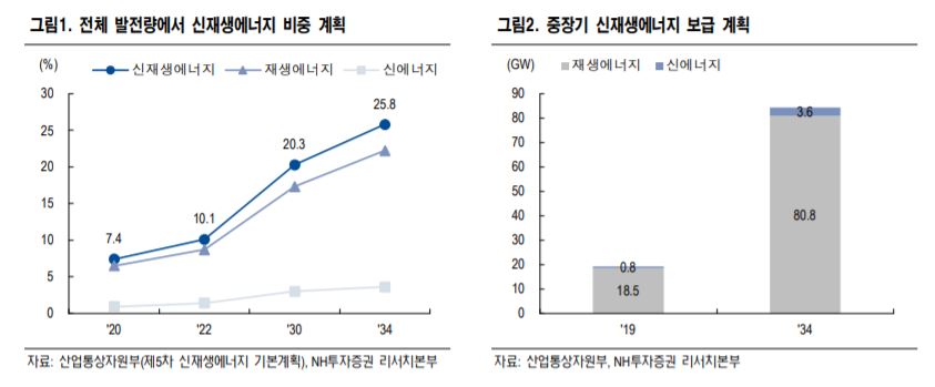 정연승 NH투자증권 연구원은 "이번 정책으로 재생에너지 보급 방향성이 구체화했고, 목표가 상향됐다"면서 "향후 2050년 탄소 중립을 위해서는 신재생에너지 효율 개선, 잠재량 확충, 전력 계통 전환, 재생에너지 단점을 보완해줄 수소에너지 확산이 필요하다"고 짚었다.