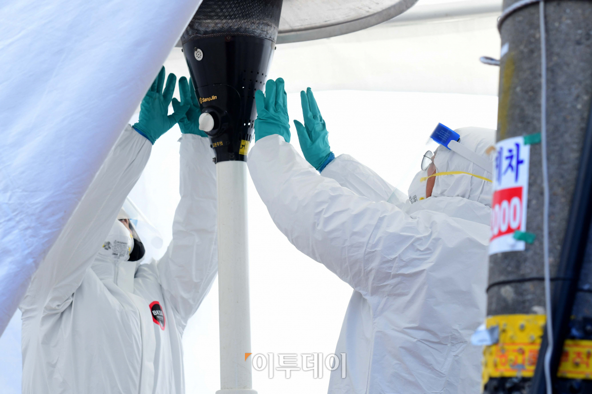 30일 서울 구로구 미소들요양병원에서 의료진이 난로 곁에서 몸을 녹이고 있다.