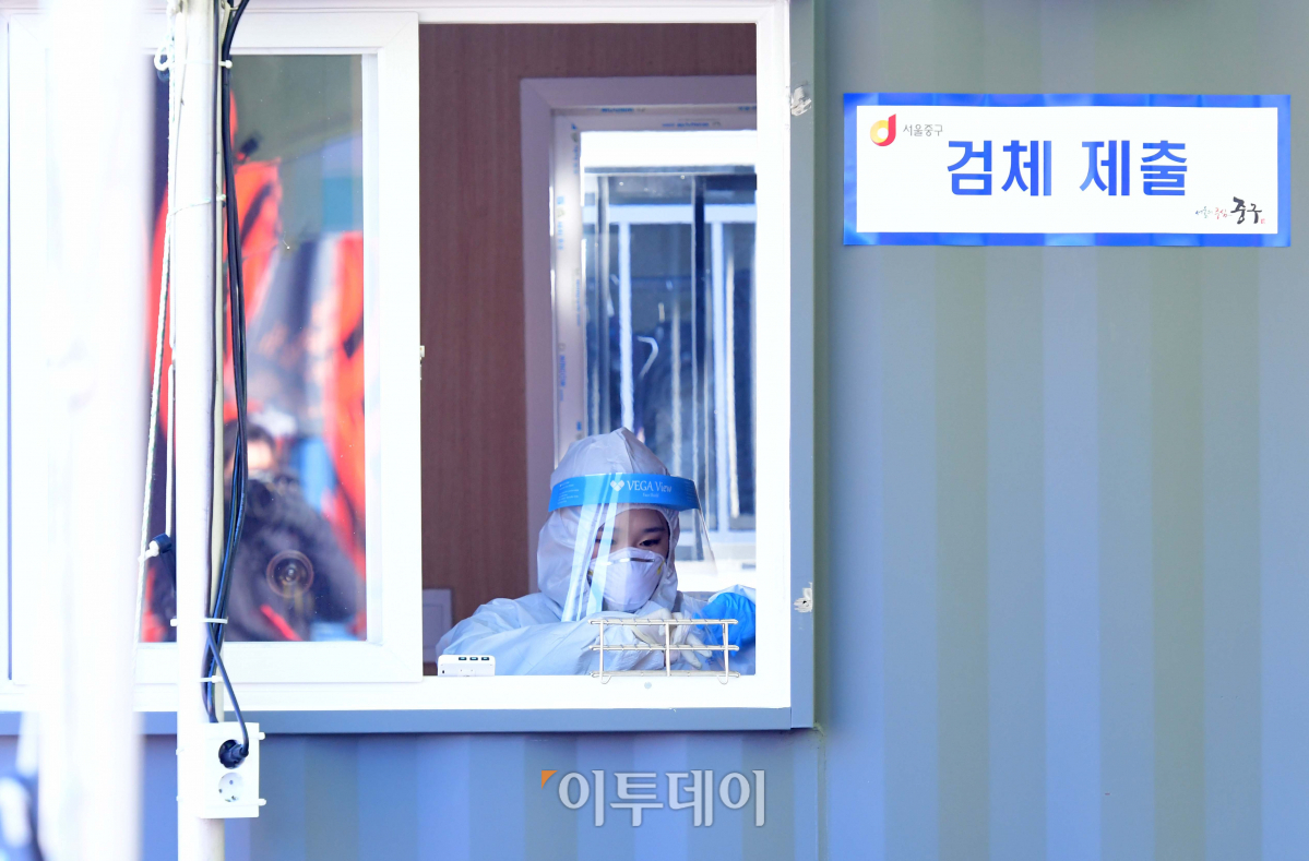 30일 서울역 광장에 마련된 서울 중구 임시 선별검사소에서 의료진이 코로나19 검사를 하고 있다.