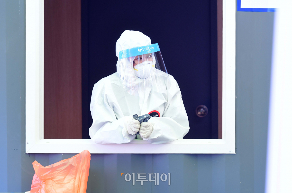 30일 서울역 광장에 마련된 서울 중구 임시 선별검사소에서 의료진이 손난로로 몸을 녹이고 있다.