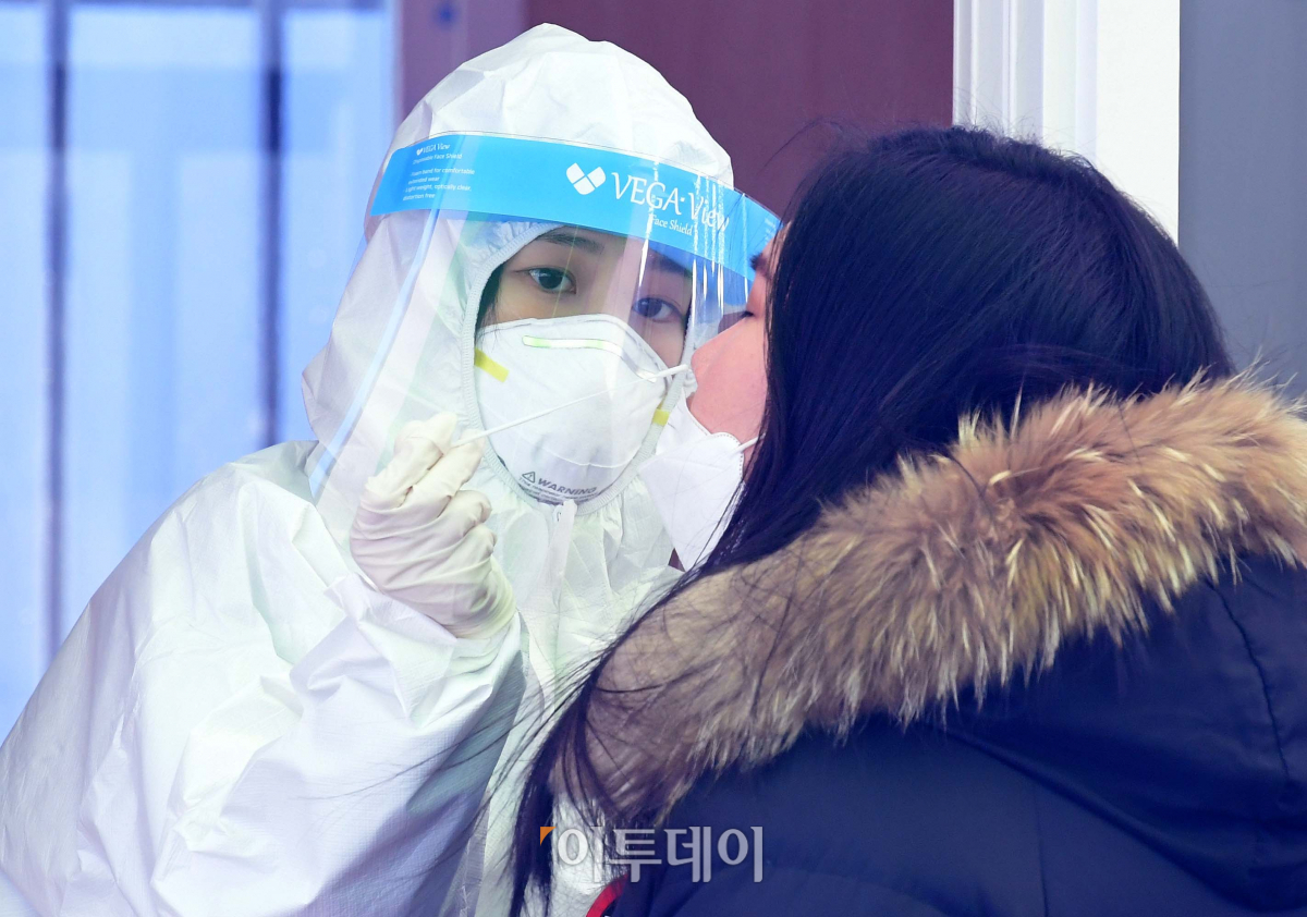30일 서울역 광장에 마련된 서울 중구 임시 선별검사소에서 의료진이 코로나19 검사를 하고 있다.