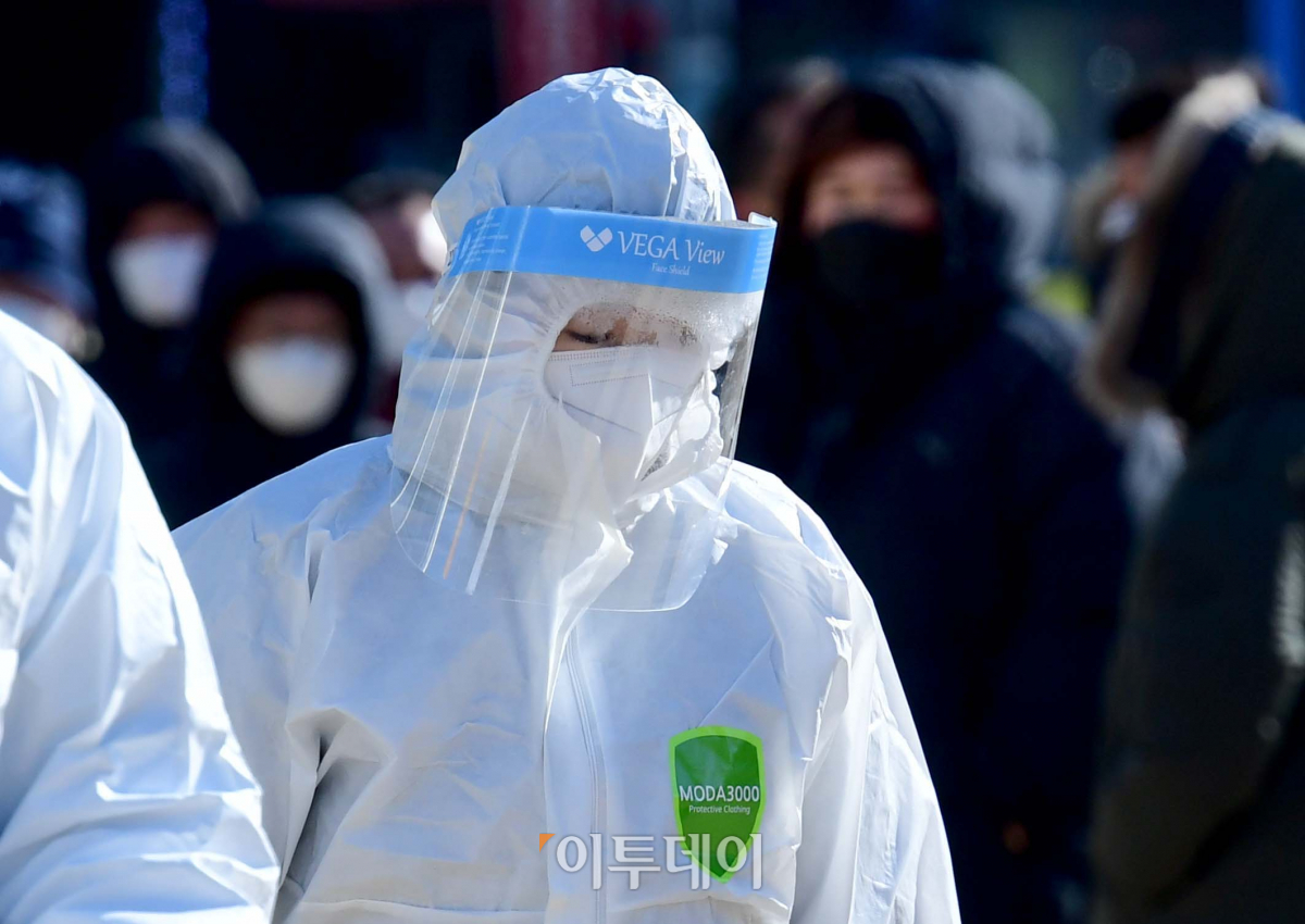 30일 용산역 광장에 마련된 서울 용산구 임시 선별검사소에서 의료진이 코로나19 검사 관련 업무를 하고 있다.