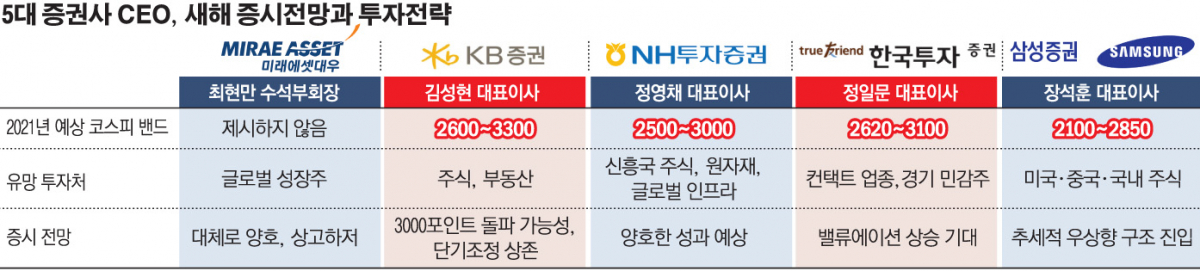 5대 증권사 CEO들은 31일 이투데이가 실시한 ‘2021년 증시 전망’ 설문을 통해 이같이 예측했다. 이들은 새해 코스피지수를 2500~3300선 사이로 전망하며 지난해보다는 목표수익률을 한 단계 낮춰 잡을 것을 권했다.