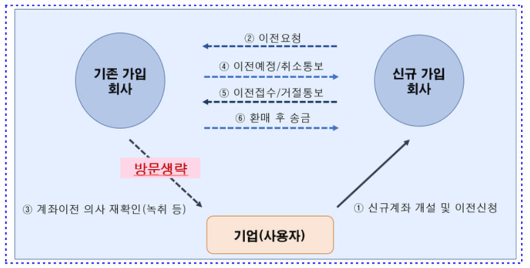 앞으로 개인뿐 아니라 기업이 퇴직연금 이전을 신청할 때 절차가 간소해진다. 기존 가입 회사와 신규 가입 회사를 모두 방문할 필요 없이 신규 금융사 1회 방문만으로 이전할 수 있고, 제출해야 하는 서류도 최대 7개에서 1∼2개로 줄어든다.