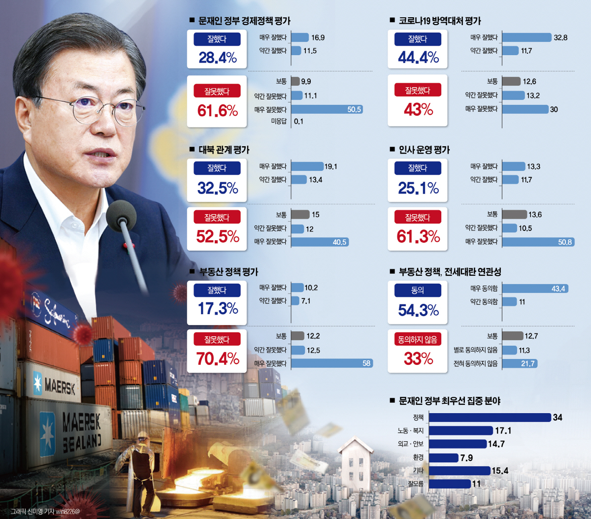 지난 4년간 문 정부의 경제정책에 대한 평가에 대해선 응답자 61.6%(매우 잘못했다 50.5%, 약간 잘못했다 11.1%)가 ‘잘못했다’고 평가했고 긍정 응답 비율은 28.4%(매우 잘했다 16.9%, 약간 잘했다 11.5%)에 불과했다. 응답자 중 50대(68.0%), 대구·경북(73.7%), 보수층(74.5%), 자영업(72.5%), 학생(72.6%) 등에서 평가가 매우 좋지 않았다. 특히 18세 이상 전 연령층과 화이트칼라, 블루칼라, 가정주부, 자영업, 학생, 농·임·어업, 무직·은퇴 등 전 직업군에서 경제정책에 대한 부정평가가 절반이 넘었다.