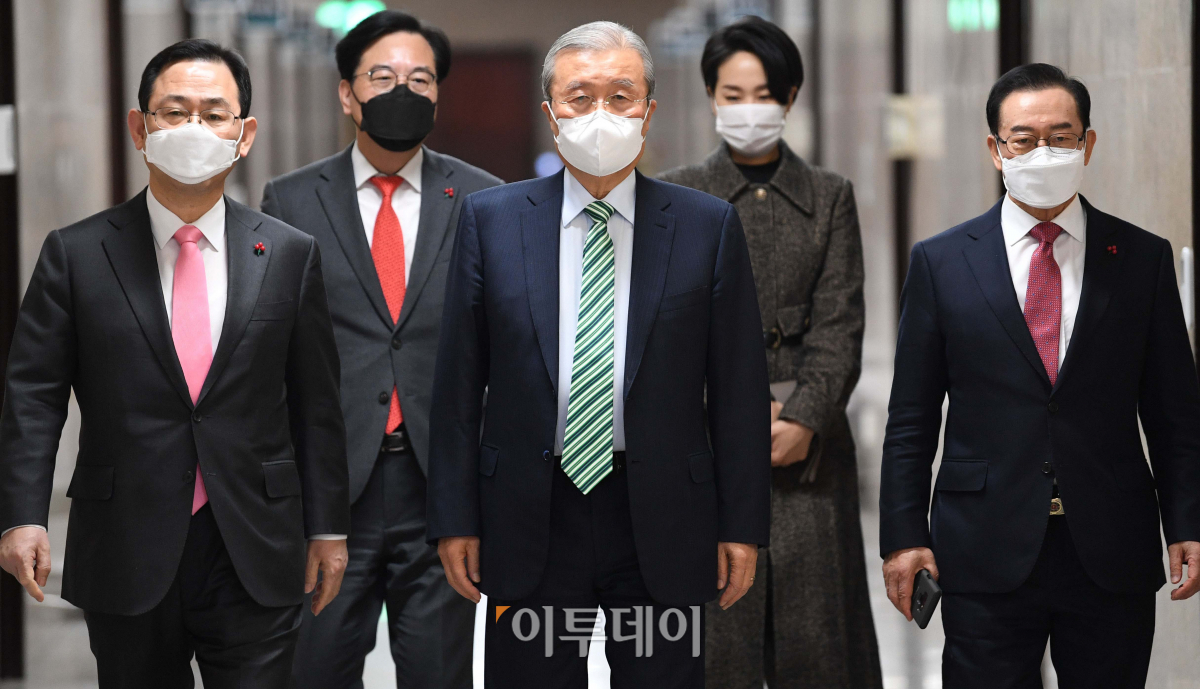 국민의힘 김종인 비상대책위원장과 주호영 원내대표가 4일 여의도 국회에서 열린 비상대책위원회의에 참석하고 있다.
