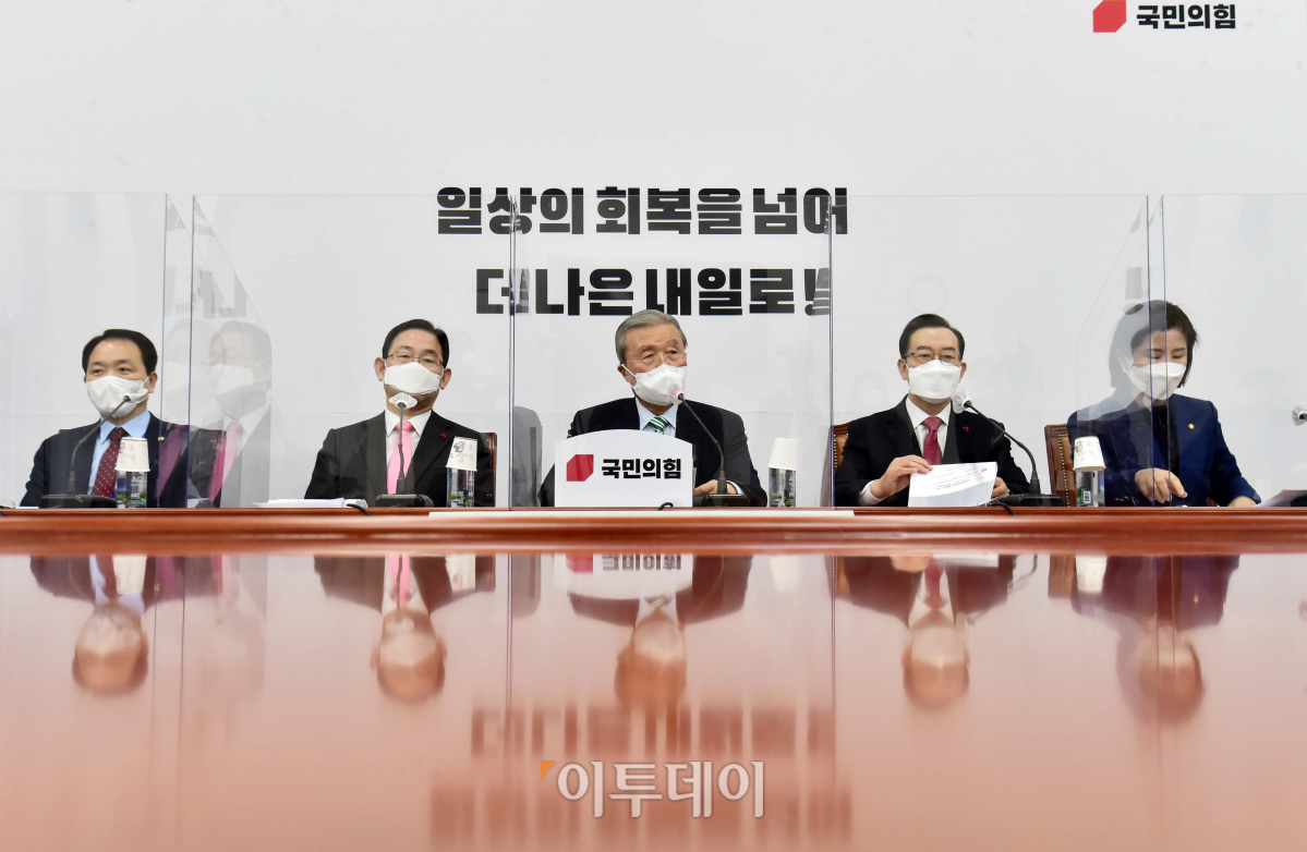 김종인 비대위원장이 4일 서울 여의도 국회 본관 228호에서 열린 국민의힘 비상대책위원회의를 주재하고 있다.