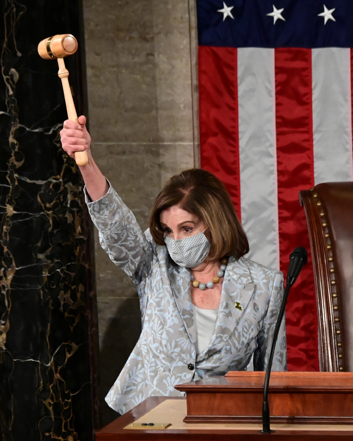 미국 민주당 소속 낸시 펠로시 하원의장이 3일(현지시간) 개원한 제117대 의회에서 하원의장으로 재선출된 후 자신만만하게 의사봉을 들어 보이고 있다. 펠로시 의장은 이날 216표를 얻어 209표를 받은 공화당의 경쟁 후보 케빈 매카시 원내대표를 누르고 승리했다. 2007년 여성 최초로 하원의장에 선출된 뒤 3번의 임기를 거친 펠로시 의장은 이로써 4번째 임기를 시작하게 되며, 81세의 고령이라는 점을 감안하면 이번을 끝으로 은퇴할 것으로 보인다. 워싱턴D.C./로이터연합뉴스