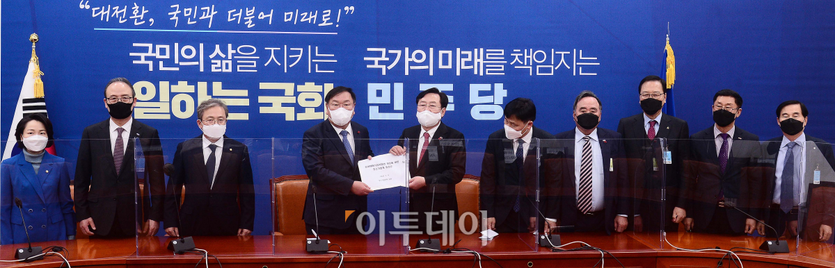 더불어민주당 김태년 원내대표(왼쪽에서 네번째)가 4일 오후 서울 여의도 국회에서 열린 중대재해법 관련 중소기업단체 간담회에서 김기문 중소기업중앙회 회장(왼쪽에서 다섯번째)으로 부터 '중대재해기업처벌법 제정에 대한 중소기업계 입장문'을 전달받고 있다.