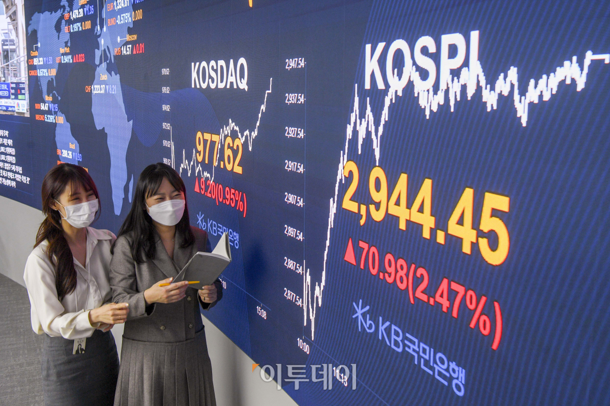 코스피가 새해 첫 거래일인 4일 2900선을 돌파했다. 이날 서울 여의도 KB국민은행 딜링룸 전광판에 코스닥, 코스피 지수가 표시돼 있다. 이날 코스피는 전 거래일보다 70.98포인트(2.47%)오른 2944.45에 코스닥은 9.20포인트(0.95%) 오른 977.62로 마감했다.