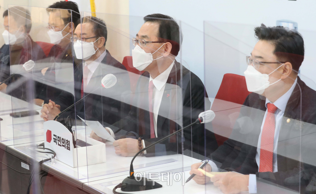 주호영 국민의힘 원내대표가 5일 오전 국회에서 열린 원내-법사위원 간담회에 참석해 모두발언을 하고 있다.