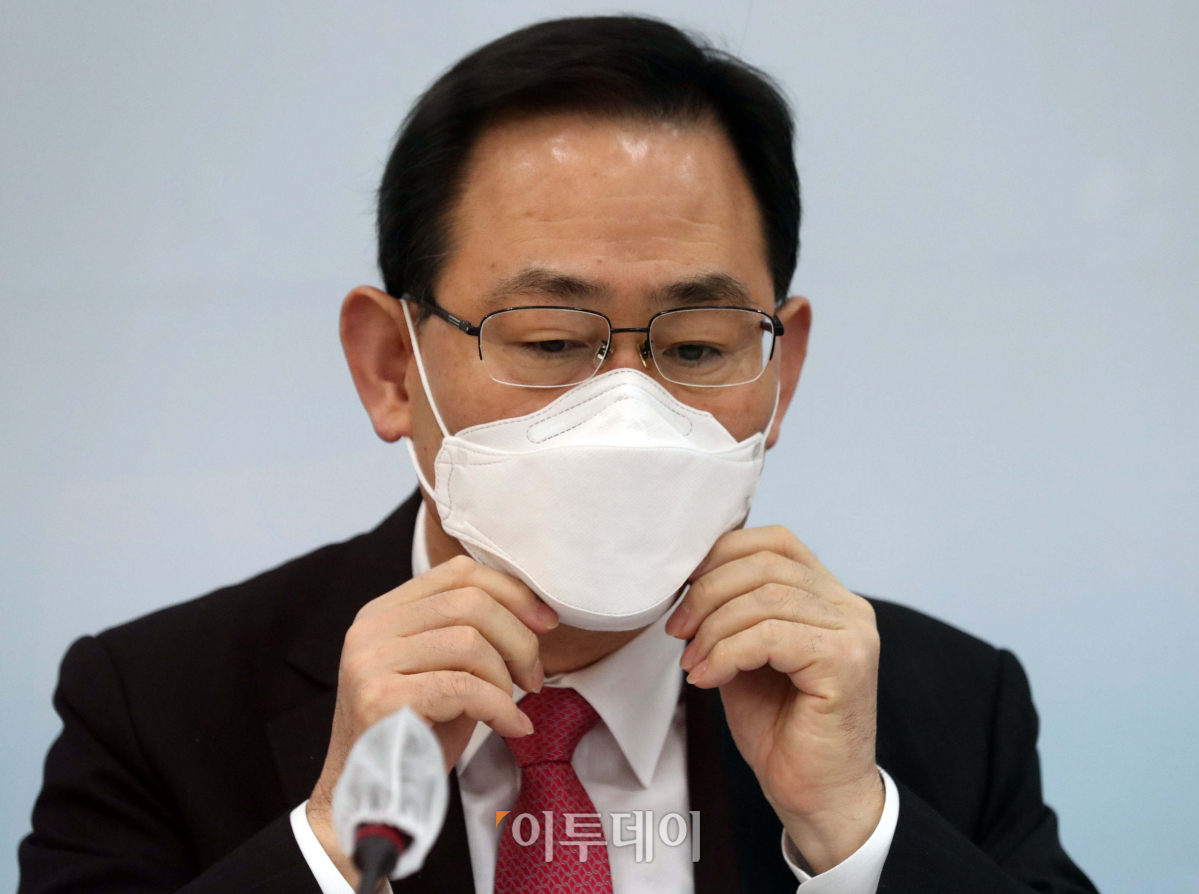 주호영 국민의힘 원내대표가 5일 오전 국회에서 열린 원내-법사위원 간담회에서 모두발언 후 마스크를 고쳐쓰고 있다.