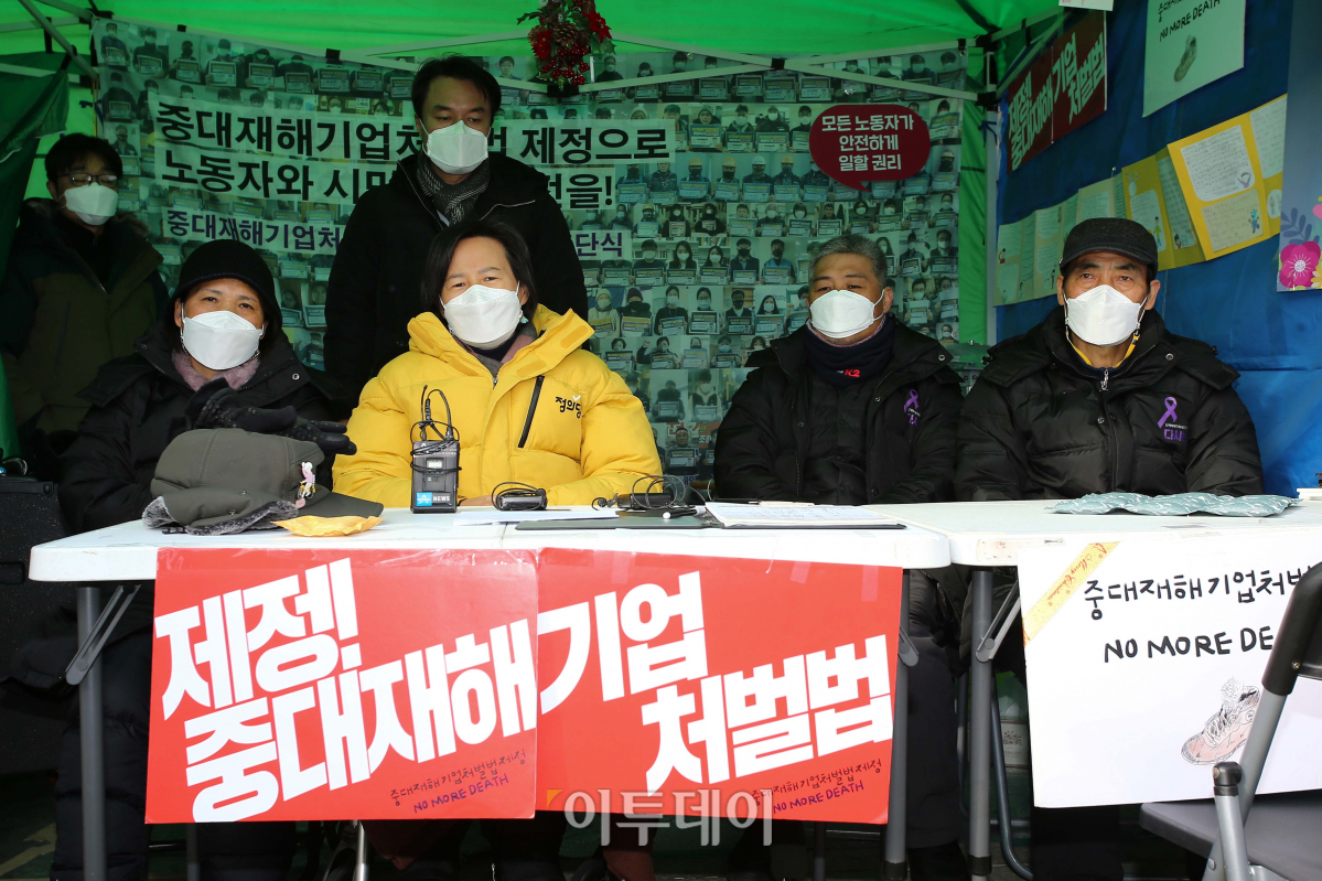 중대재해기업처벌법 제정을 촉구하며 단식농성 중 병원에 이송된 정의당 강은미 원내대표(왼쪽 두번째)가 5일 국회 본관 앞 단식농성장에 복귀하며 발언하고 있다.