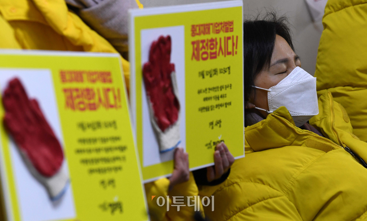 정의당 강은미 원내대표가 5일 여의도 국회 법사위원회 전체회의실 앞에서 손팻말을 들고 중대재해기업처벌법 제정을 촉구하고 있다.