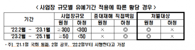 그러나 법 적용이 50인 이상 300인 미만 사업장은 공포 후 2년간, 50인 미만 사업장은 공포 후 4년간 유예돼 유예 기간 중 중대 재해가 발생하면 직접 당사자인 하청은 면책이 되지만, 간접 당사자인 원청만 처벌되는 상황이 발생할 수 있다.