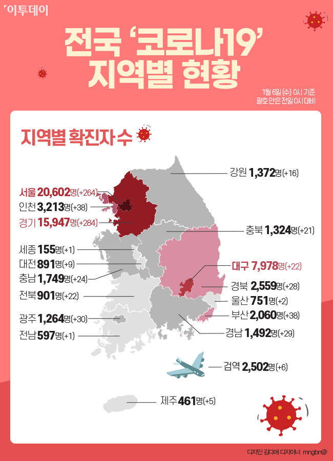 질병관리청 중앙방역대책본부에 따르면 1월 6일 0시 기준, 전일 0시 대비 840명이 추가 확진 판정을 받아 전국 확진자 수는 6만5818명으로 늘었다.