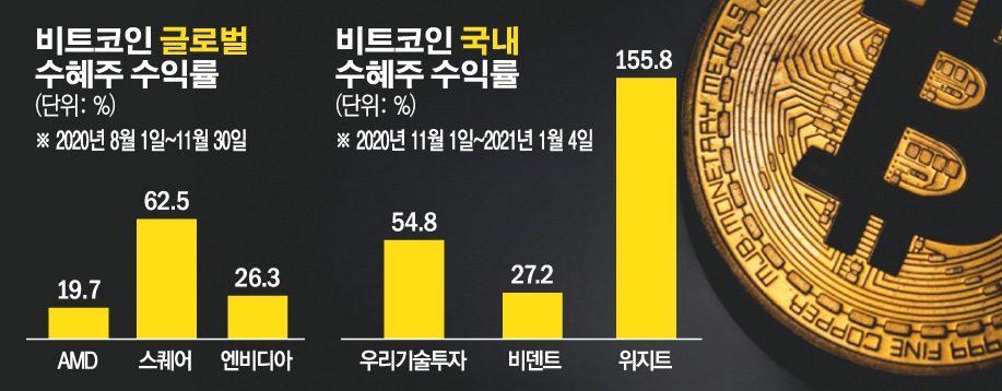 이들 종목의 공통점은 비트코인 수혜주라는 것이다. 비트코인 가격은 8월부터 12월까지 150% 이상 상승하는 등 주식, 금 등 다른 투자자산과 비교해 월등한 수익률을 기록했다. 비트코인 수혜주가 덩달아 주목받은 이유다.
