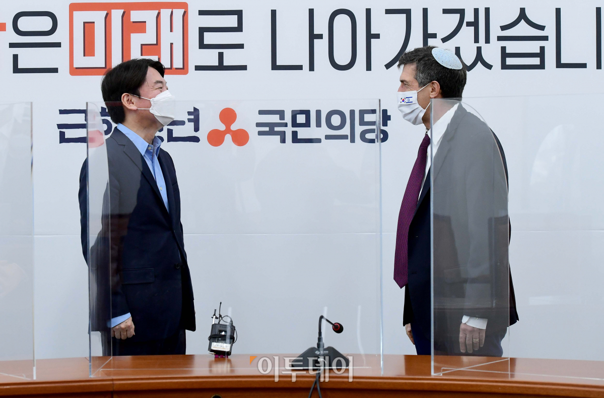안철수 국민의당 대표가 7일 서울 여의도 국회에서 아키바 토르 주한 이스라엘 대사의 예방을 받고 있다.