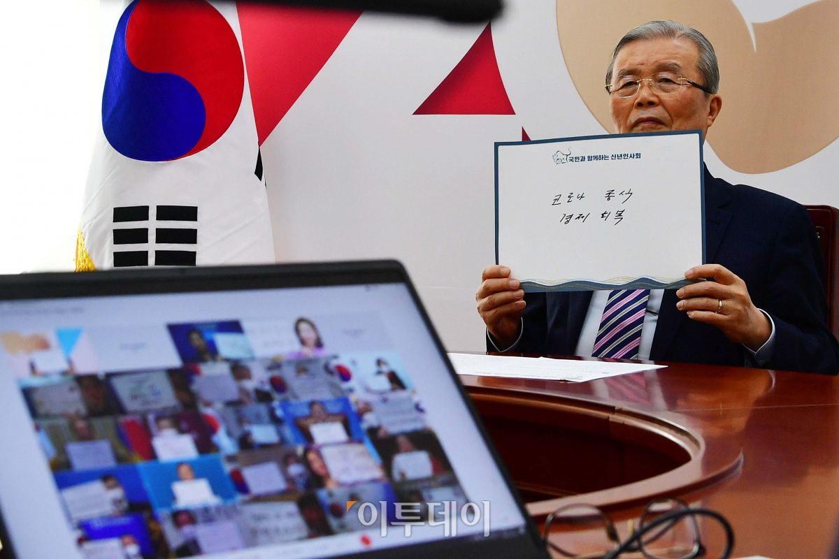 국민의힘 김종인 비상대책위원장이 7일 오전 국회에서 문재인 대통령의 신년인사회에 화상으로 참석해 기념촬영을 하며 '코로나 종식 경제회복'이라는 피켓을 들어보이고 있다. 정부 신년인사회는 '위기에 강한 나라, 든든한 대한민국'이라는 주제로 사회적 거리두기로 온 국민이 불편을 겪고 있는 상황임을 감안해 5부 요인과 주요 정당 대표, 특별초정 된 일반 국민 등 50여명이 온라인 영상회의 형식으로 신년 인사를 나눴다.