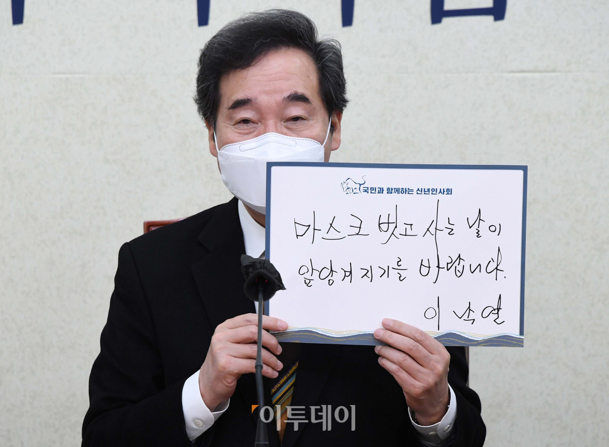 더불어민주당 이낙연 대표가 7일 오전 국회 당대표실에서 문재인 대통령의 신년인사회에 화상으로 참석해 '마스크 벗고 사는 날이 앞당겨지기를 바랍니다' 손 팻말을 들고 기념촬영을 하고 있다. 정부 신년인사회는 '위기에 강한 나라, 든든한 대한민국'이라는 주제로 사회적 거리두기로 온 국민이 불편을 겪고 있는 상황임을 감안해 5부 요인과 주요 정당 대표, 특별초정 된 일반 국민 등 50여명이 온라인 영상회의 형식으로 신년 인사를 나눴다.