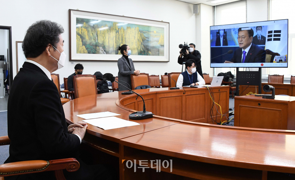 더불어민주당 이낙연 대표가 7일 오전 국회 당대표실에서 문재인 대통령의 신년인사회에 화상으로 참석해 대통령의 신년사를 듣고 있다. 정부 신년인사회는 '위기에 강한 나라, 든든한 대한민국'이라는 주제로 사회적 거리두기로 온 국민이 불편을 겪고 있는 상황임을 감안해 5부 요인과 주요 정당 대표, 특별초정 된 일반 국민 등 50여명이 온라인 영상회의 형식으로 신년 인사를 나눴다.