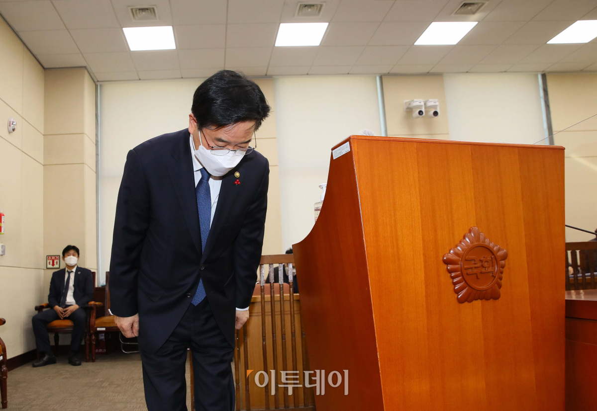 김창룡 경찰청장이 7일 국회에서 열린 행정안전위원회 전체회의에서 생후 16개월만에 양부모의 학대로 숨진 '정인이 사건'에 대해 발언을 마친 뒤 고개숙여 인사하고 있다.