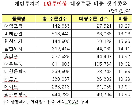 한편 개인의 1억원이상 대량주문 비중이 가장 높은 종목은 삼성전자(1.93%)이며, 다음은 현대중공업(1.86%), 동양제철화학(1.72%)이 차지했다. 개인의 1만주이상 대량주문 비중이 가장 높은 종목은 대영포장(19.29%)과 미래산업(16.03%), 한창제지(15.96%)로 주로 500원 미만의 저가주들이 차지했다.