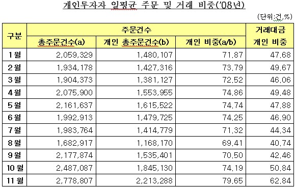 또한 전체 주문중 개인의 비중은 79.65%로 올해초에 비해 크게 늘었으며 전체 거래대금중 개인의 비중은 11월 현재 62.84%로 지난 1월 47.68%에 비해 15.16%p 증가했다.
