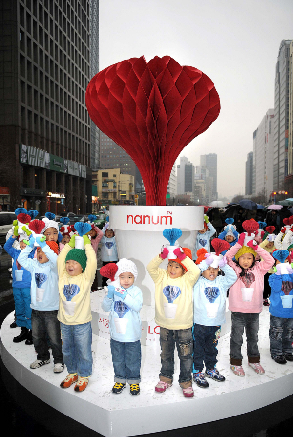 GS칼텍스는 월드비전, 카이스트 ID+IM Lab과 공동으로 기획한 '나눔 프로젝트'가 세 번째 자선상품으로 자연가습기 '러브 팟(Love Pot) 나눔'을 출시해 판매금 전액을 국내 저소득가정 아동 교육사업에 지원한다고 4일 밝혔다. 사진은 청계 광장에서 펼쳐진 나눔 프로젝트의 '러브 팟 나눔' 출시 행사 모습이다.