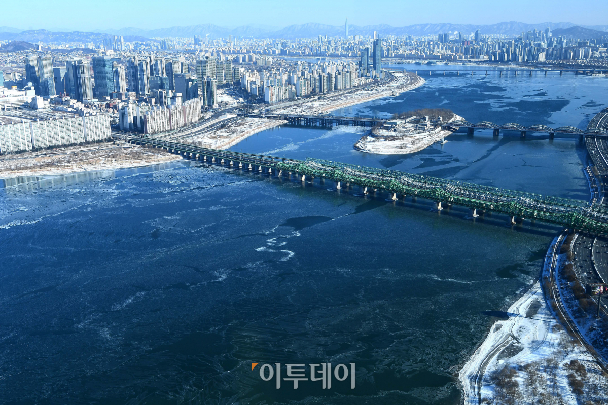 서울 아침 기온이 영하 18.6도로 35년 만에 최저를 기록하는 등 한파가 정점에 달한 8일 서울 여의도 63스퀘어에서 바라본 한강이 얼어붙어 있다.