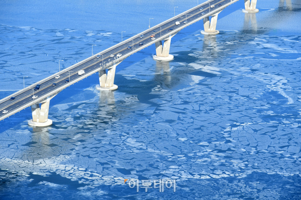 서울 아침 기온이 영하 18.6도로 35년 만에 최저를 기록하는 등 한파가 정점에 달한 8일 서울 여의도 63스퀘어에서 바라본 한강이 얼어붙어 있다.
